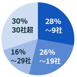 30%の人が30社以上に応募しています。リクルートエージェントでの応募社数の集計なので、リクルートエージェント以外のエージェントを含めると、もっと多くの企業に応募していると思われます。